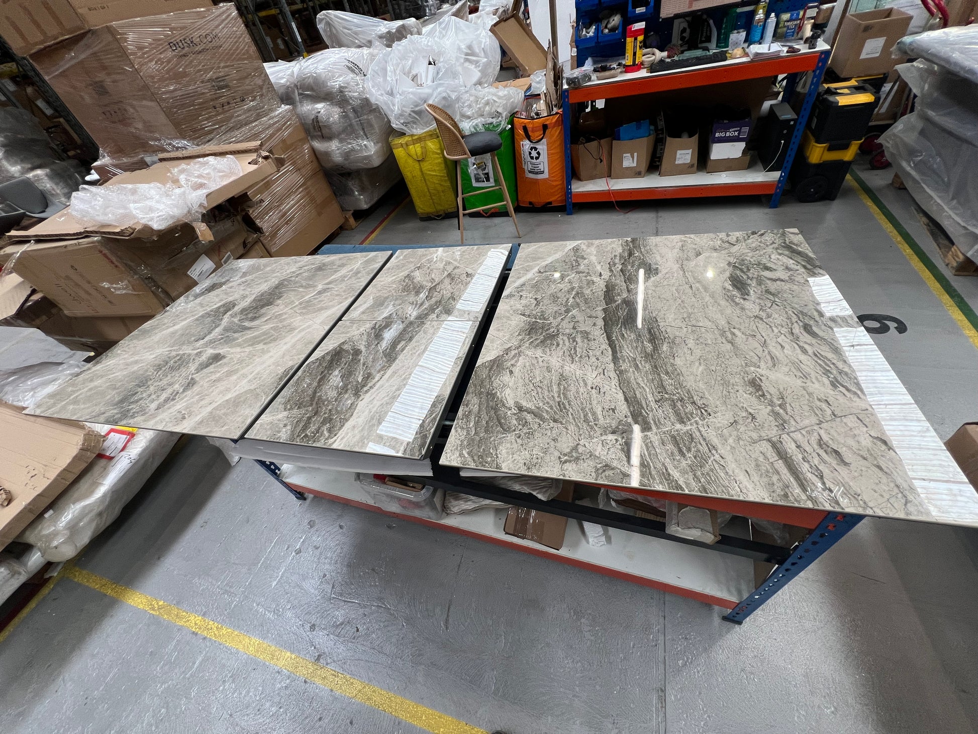 - DFS Teno Extending 6-8 Seater Dining Table Teno Grey Grey RRP £799 - Table is chipped in centre. No fittings.