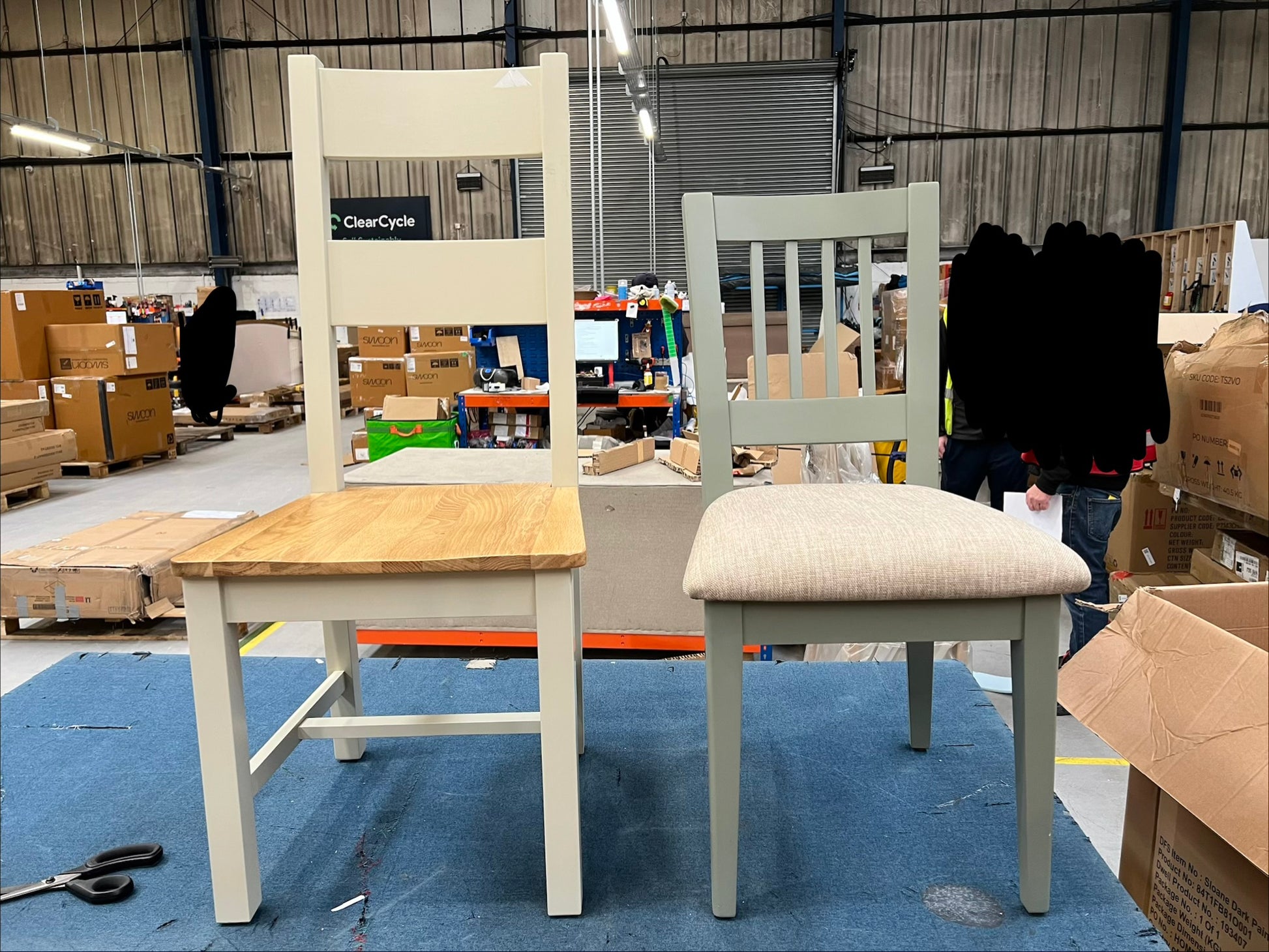 Mismatched chairs, one crakced.