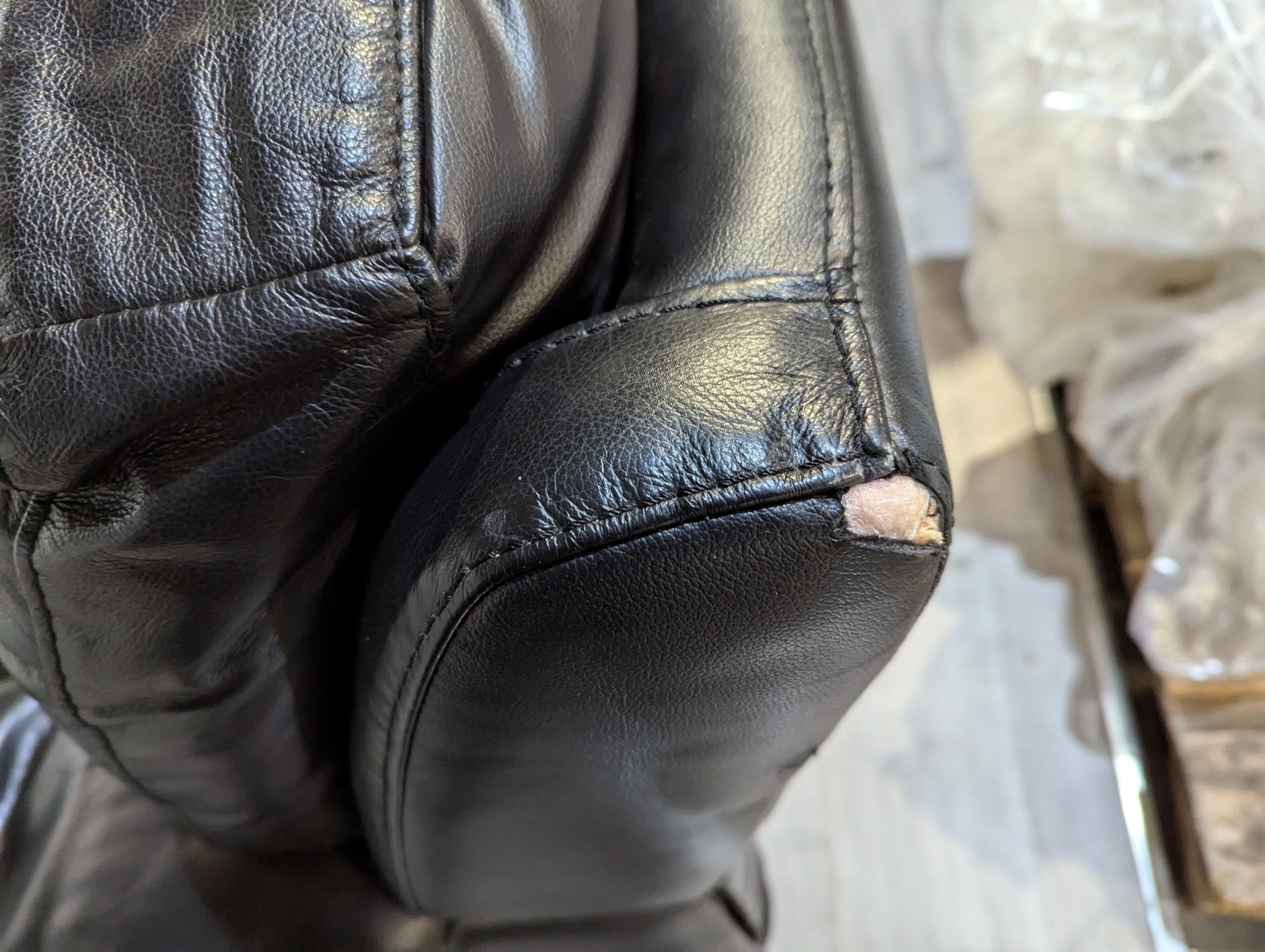 Scuffs and rips to the leather, dirty, deep impression marks on arms, missing power pack