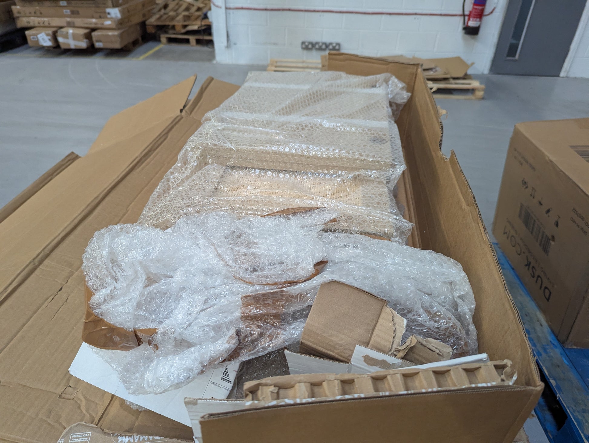 Empty pallets can be left on site when purchases are collected, although this is not a requirement. All other packaging is purchased with the items and is the property of the buyer, as such it must be taken when the order is collected.