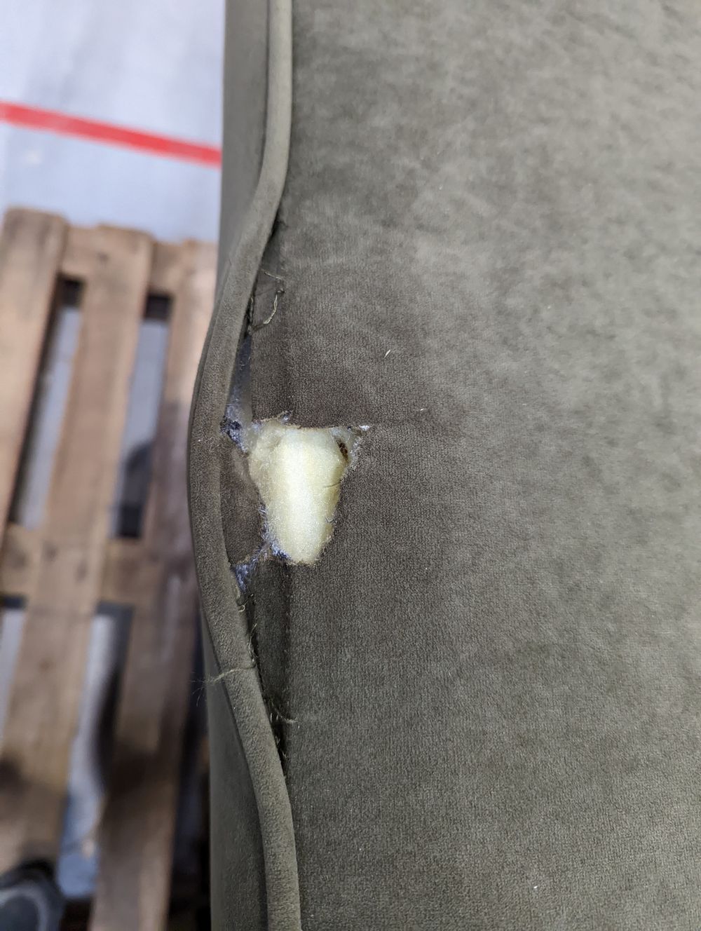 has rip on the top of the arm on the chaise and smaller rip at bottom of same arm also missing its feet