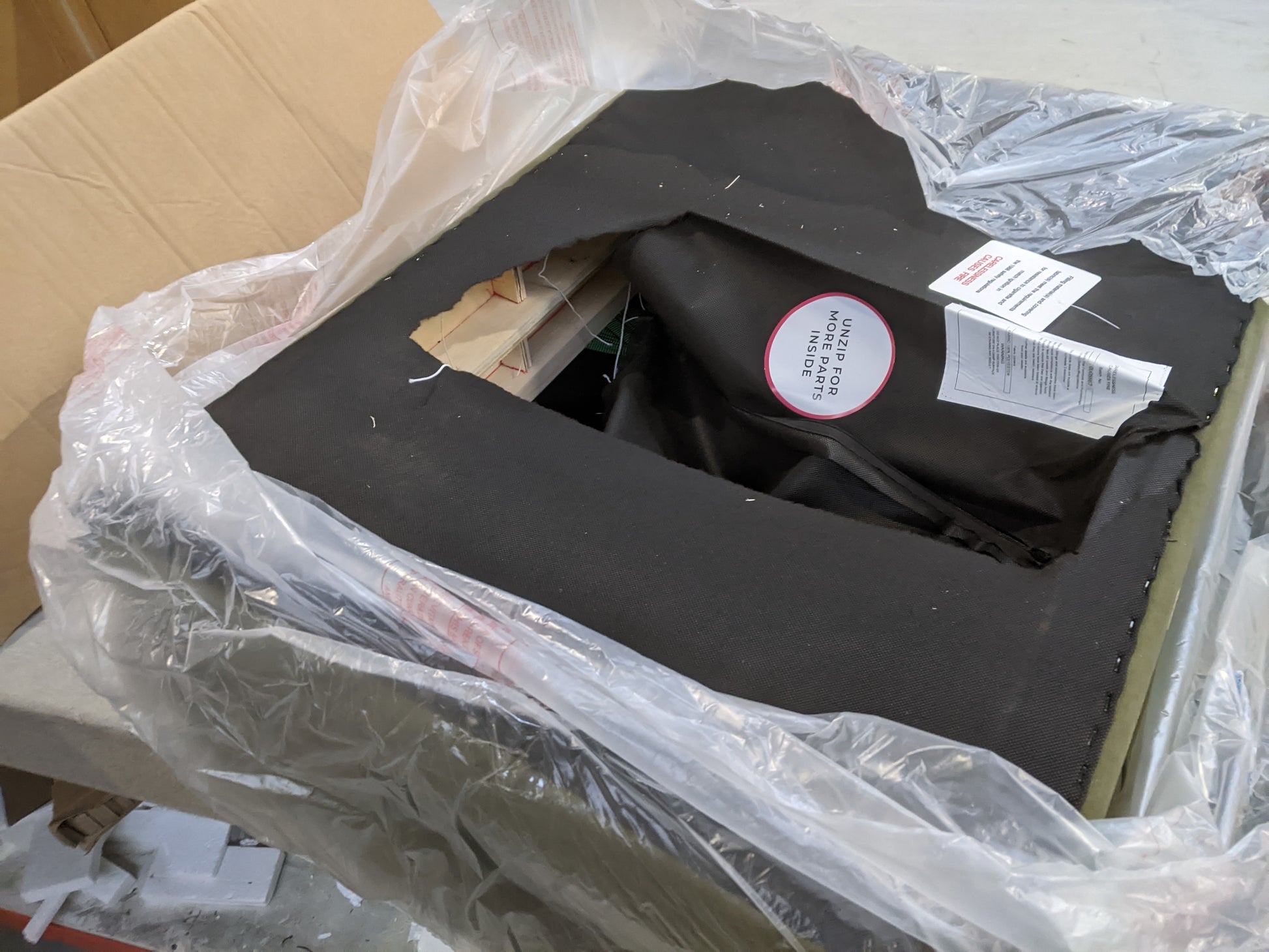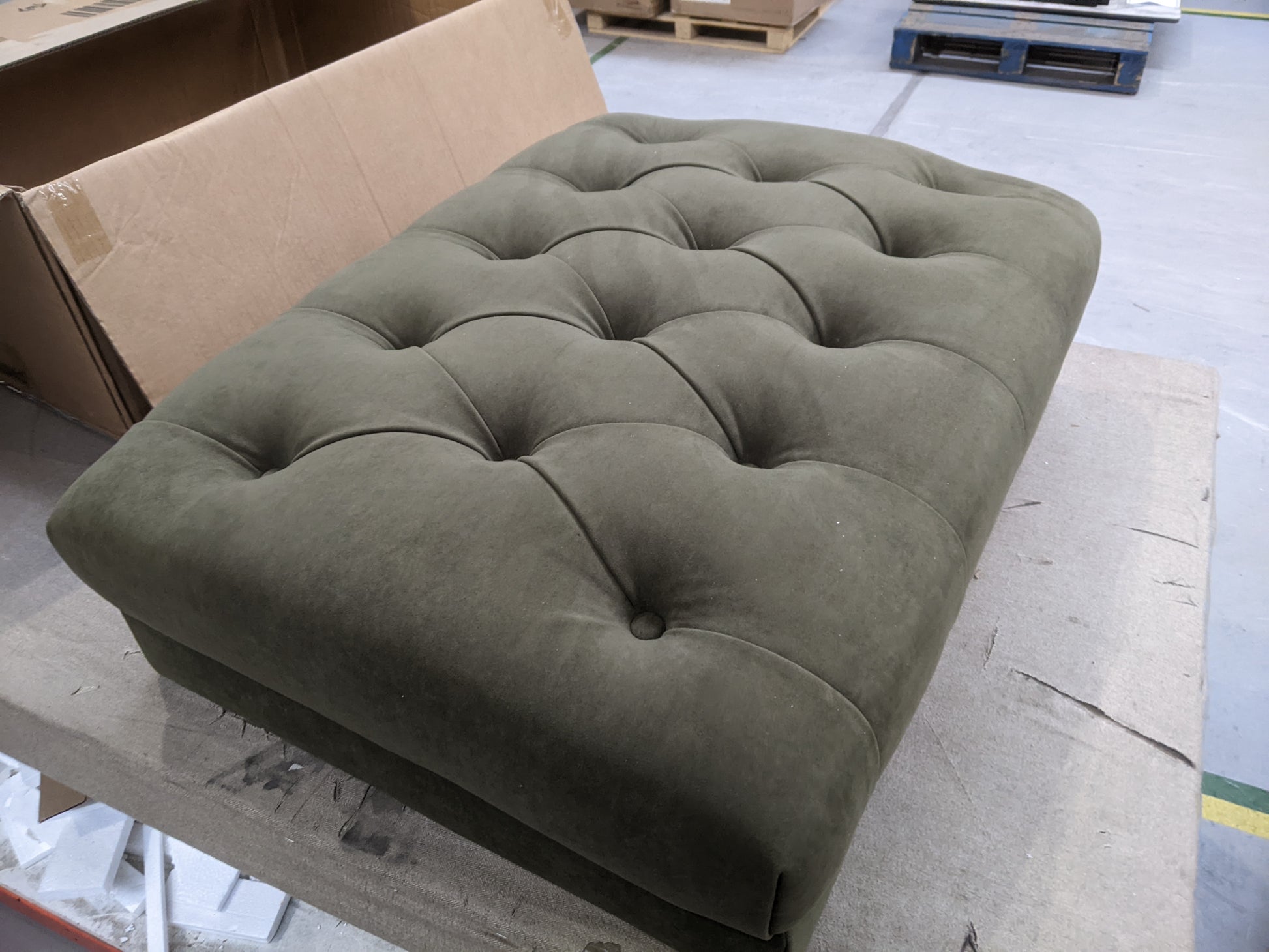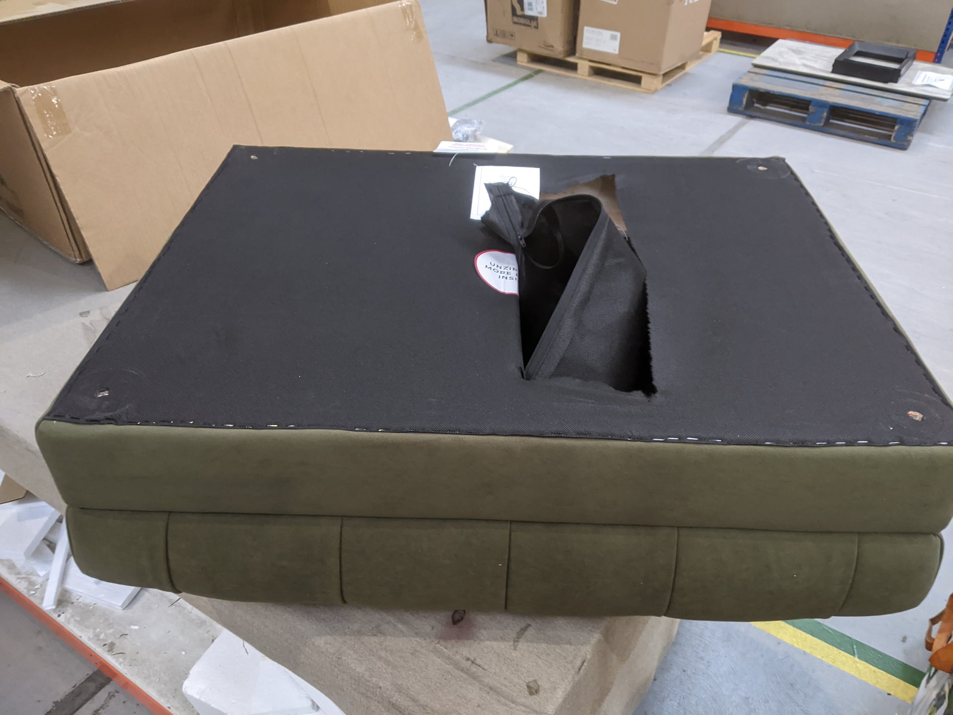 Damaged underneth of the pouffe . Legs missng
