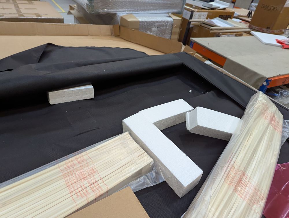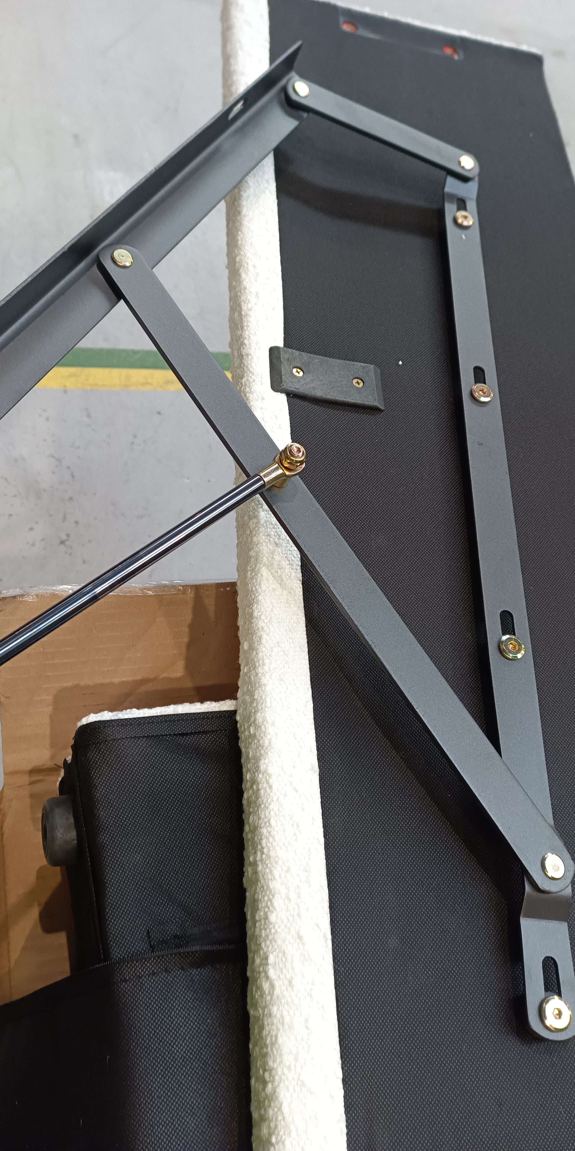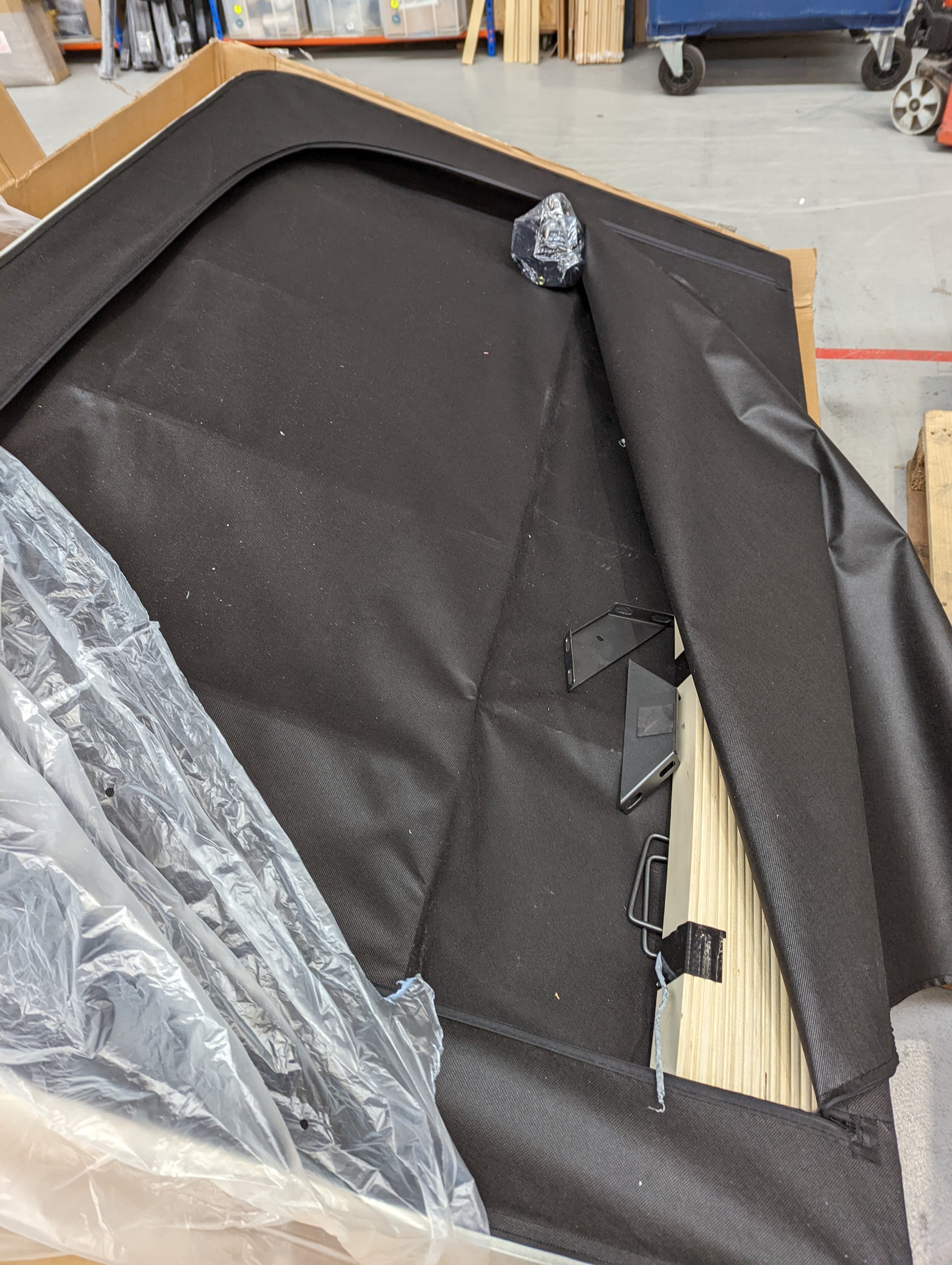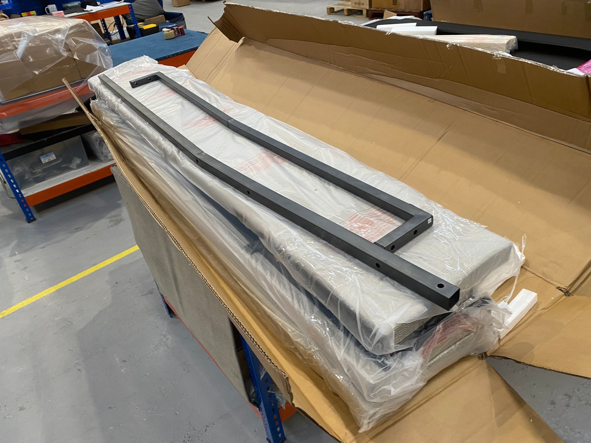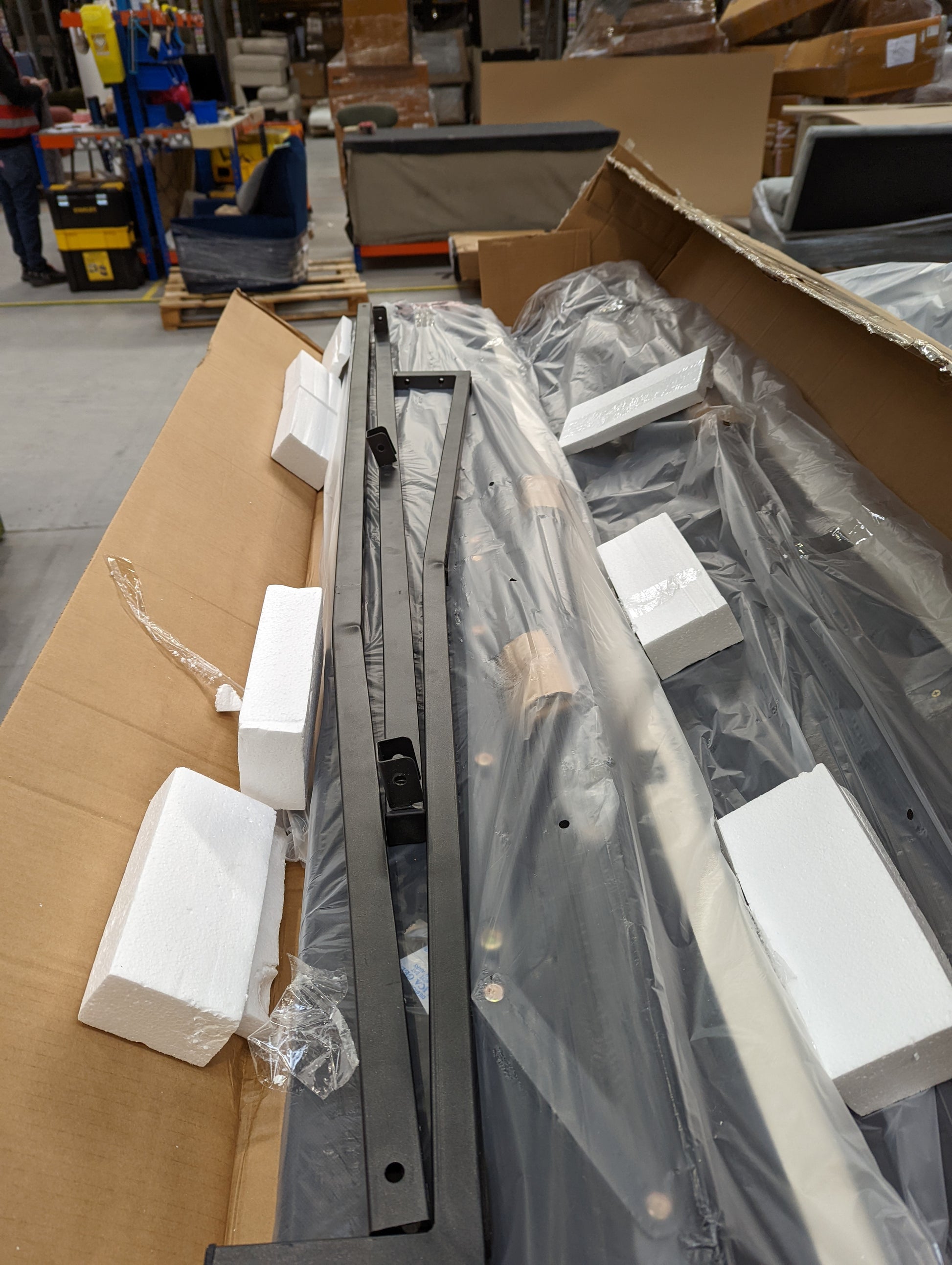 Headboard frame snapped - centre rail and central support rail bent. fittings box and 'side ottoman metal frames' missing