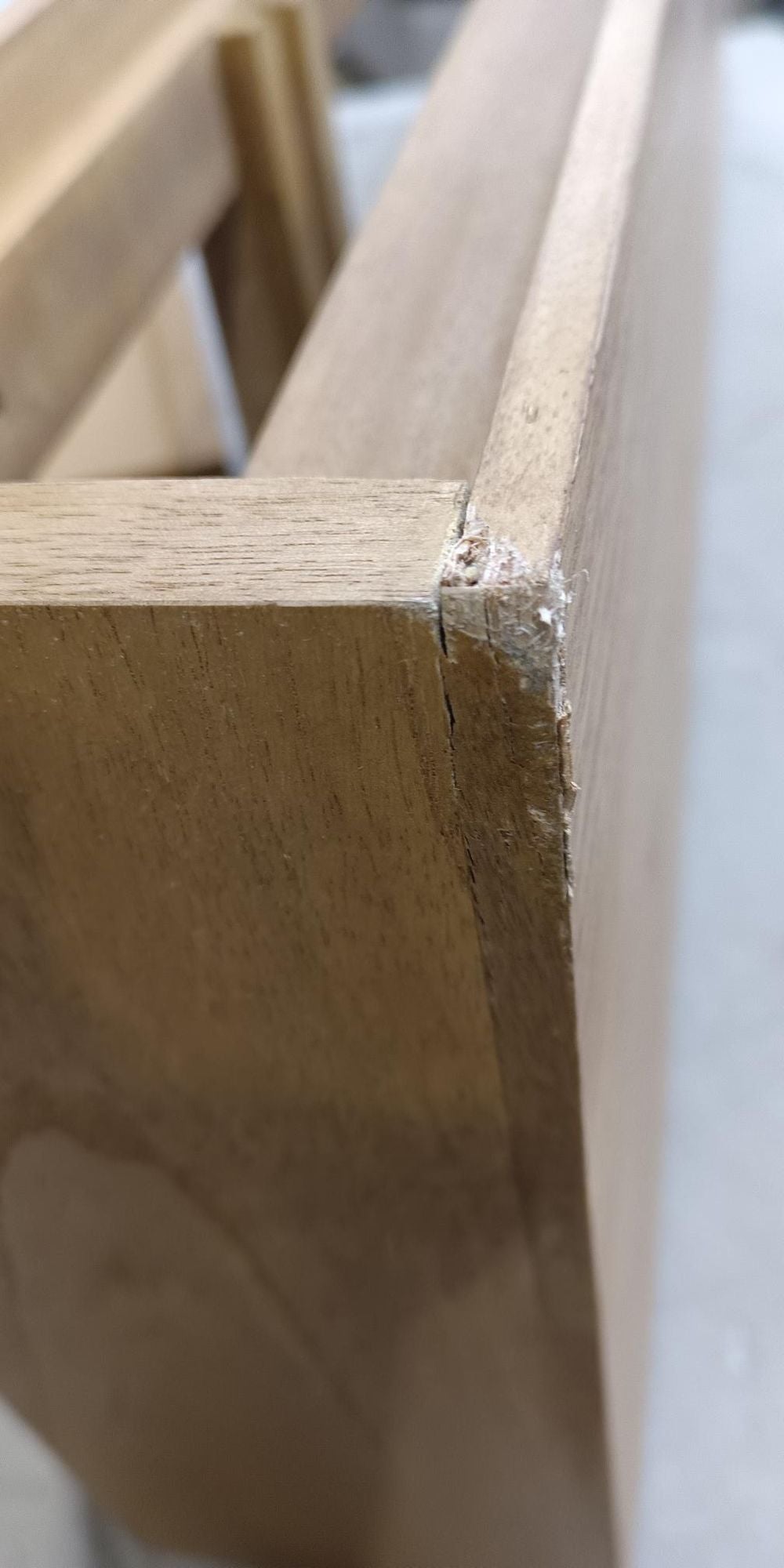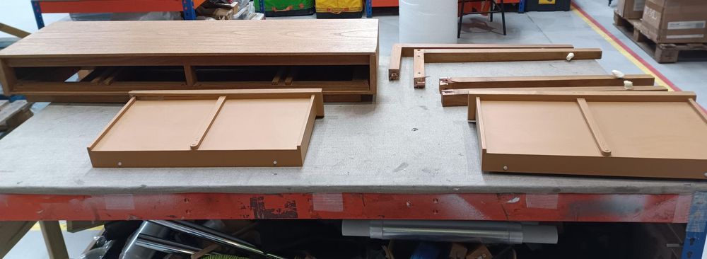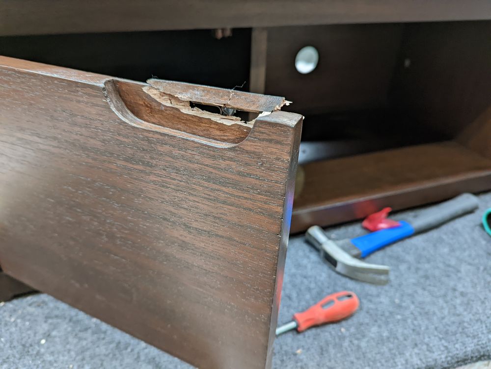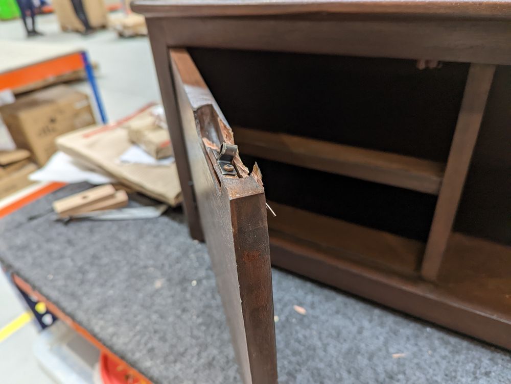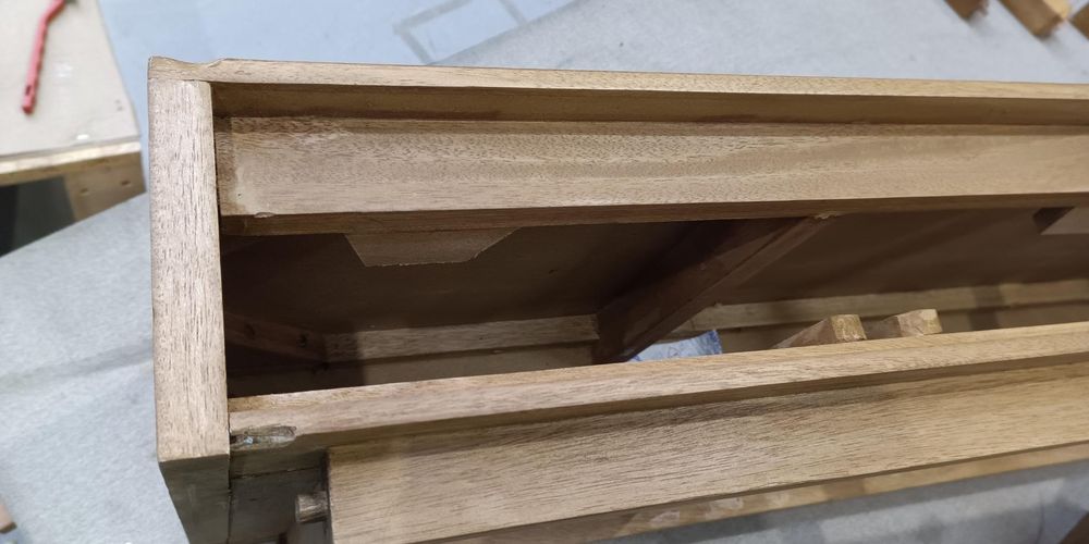 The top is badly damaged and split in 3 places, both drawer fronts are detached from the drawers. Both of the double legs are snapped completely off and there are no fittings.
