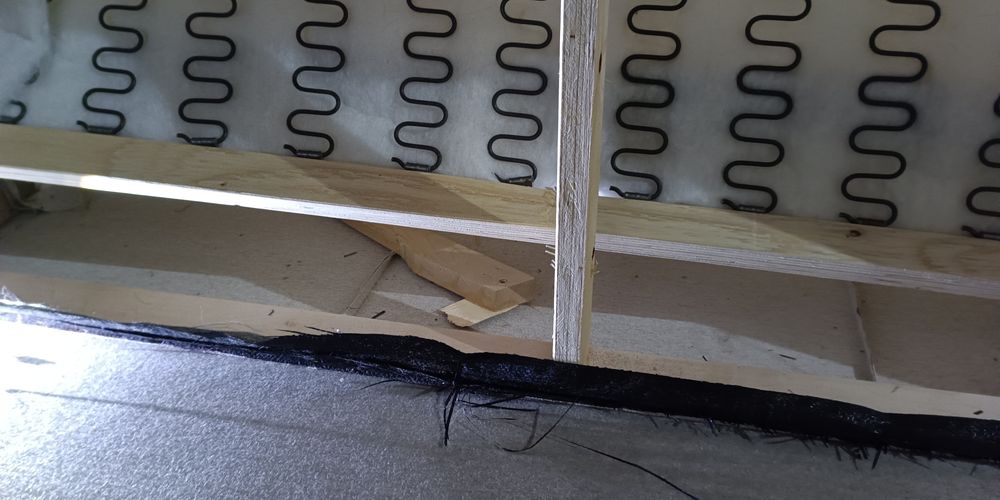 Damage to frame of the sofa on the underside. Parts are snapped and have detached from the framework.