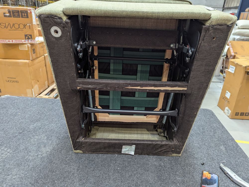 reclining mechanism is broken it reclines its self when sat on it also missing legs