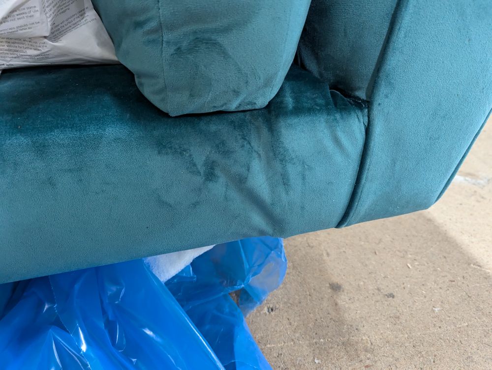- Marks and Spencer Finch Large 3 Seater Sofa in Peacock House Velvet RRP £1199 - One spring is unattached. Front border rail has failed on the joint. Soiled. No feet.