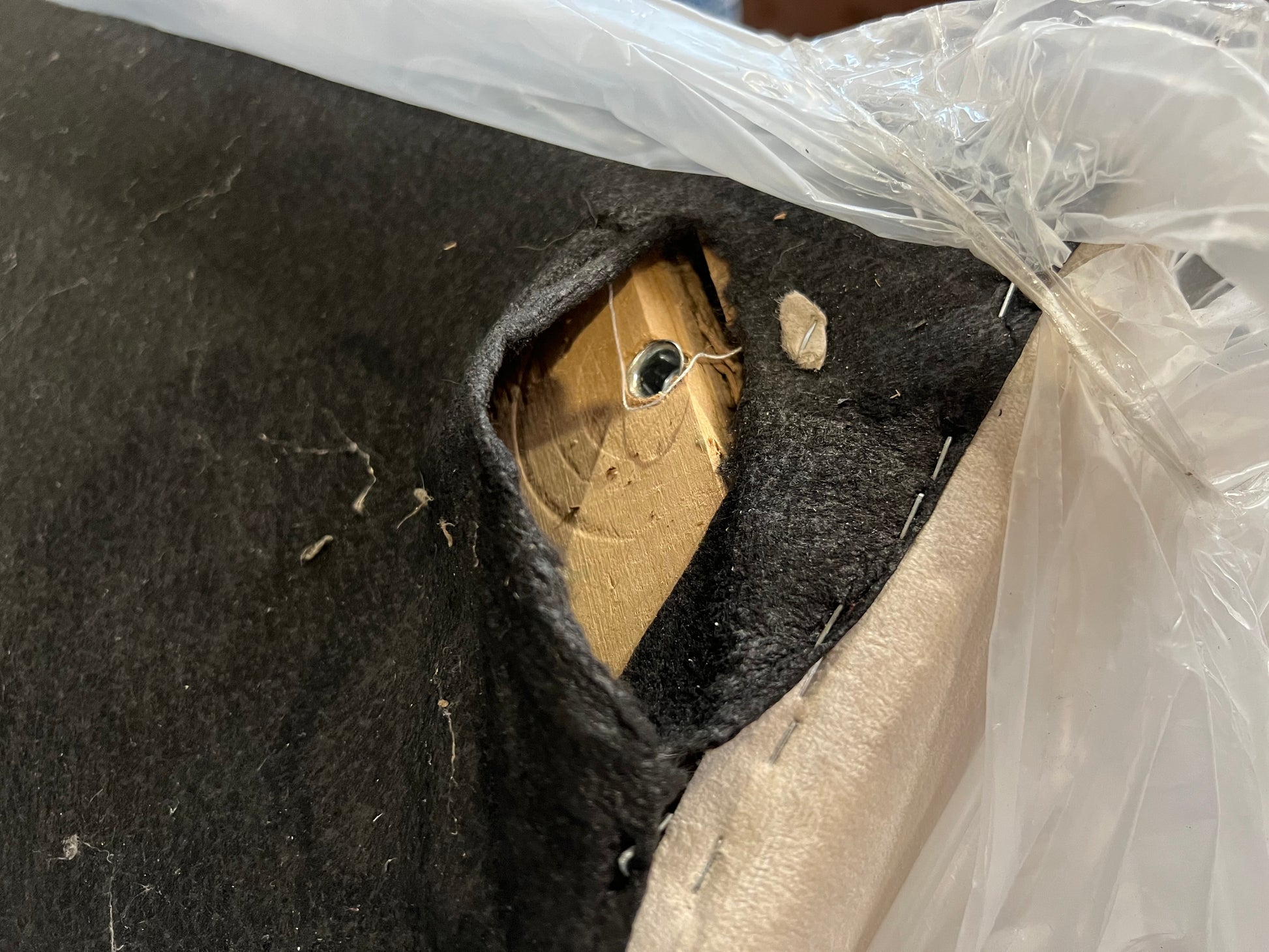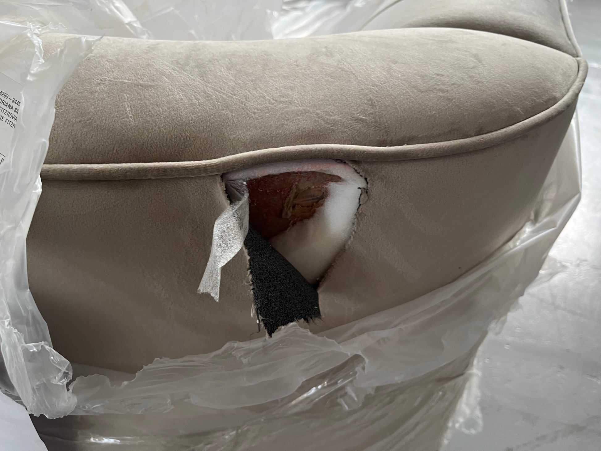 - Sofology Oscar 3-Corner-1 Fine Textured Chenille Silver Mix with Gold Trim RRP £2399 - Front of sofa damaged