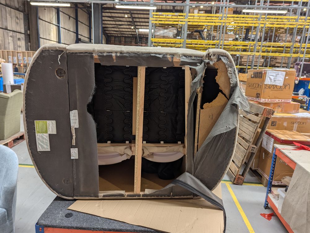 frame snapped on lhf arm causing rip in fabric and split from chair and bottom of arm has been smashed in