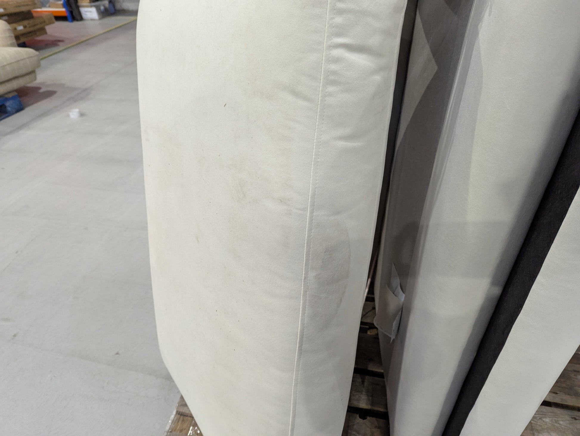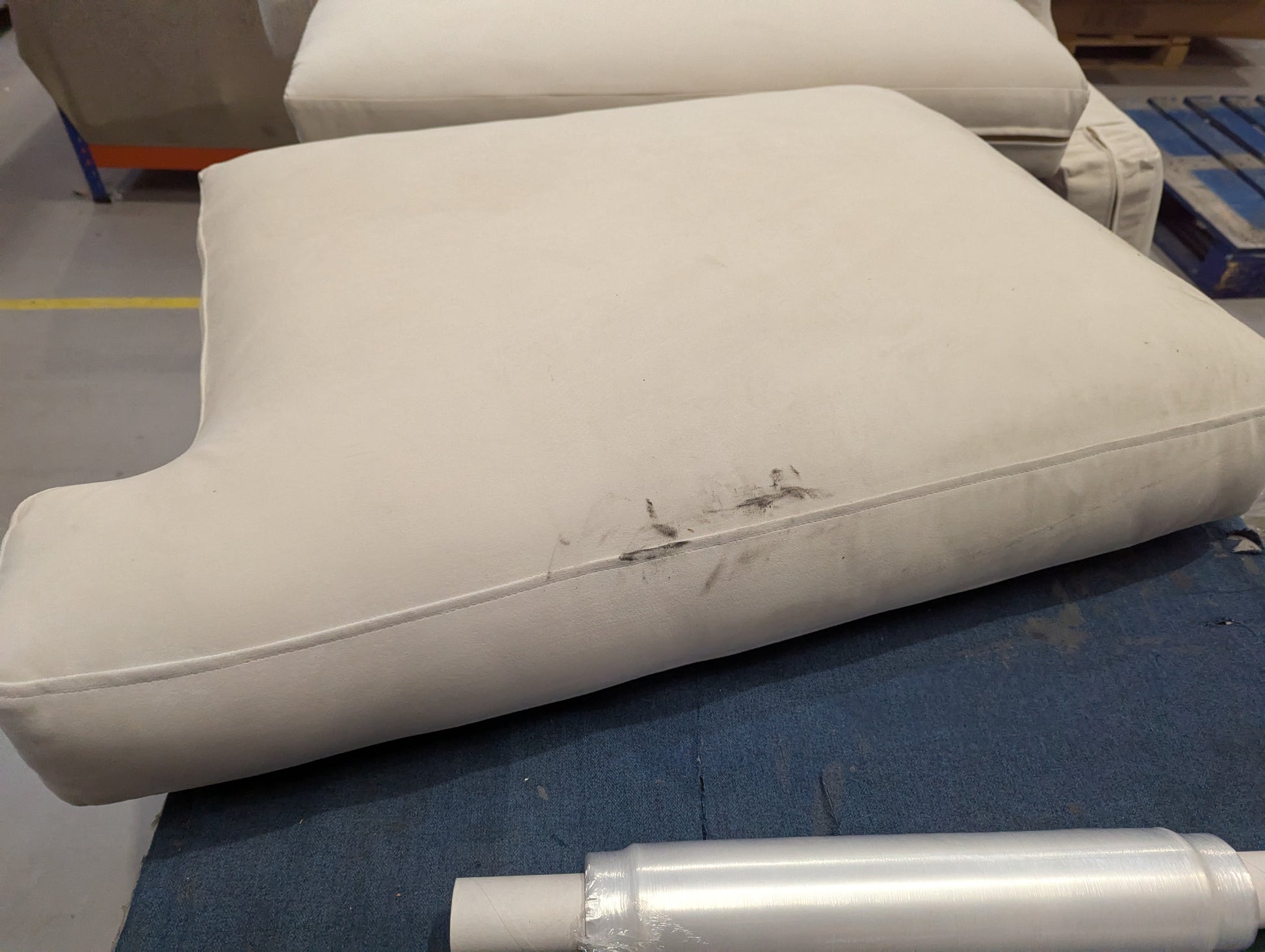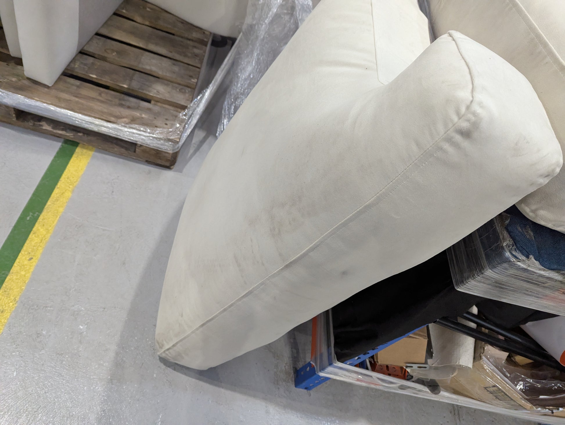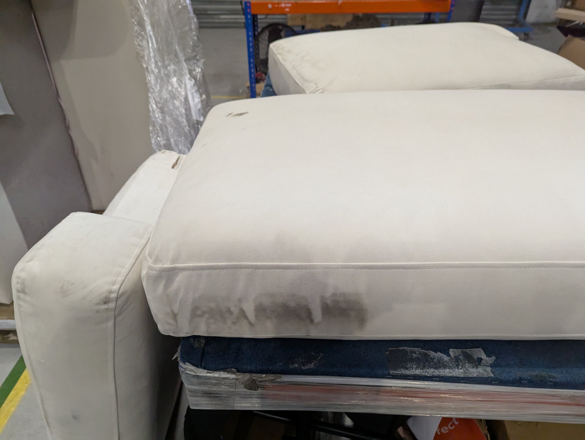Incomplete- missing feet. Cushions very dirty, oily stains on light fabric