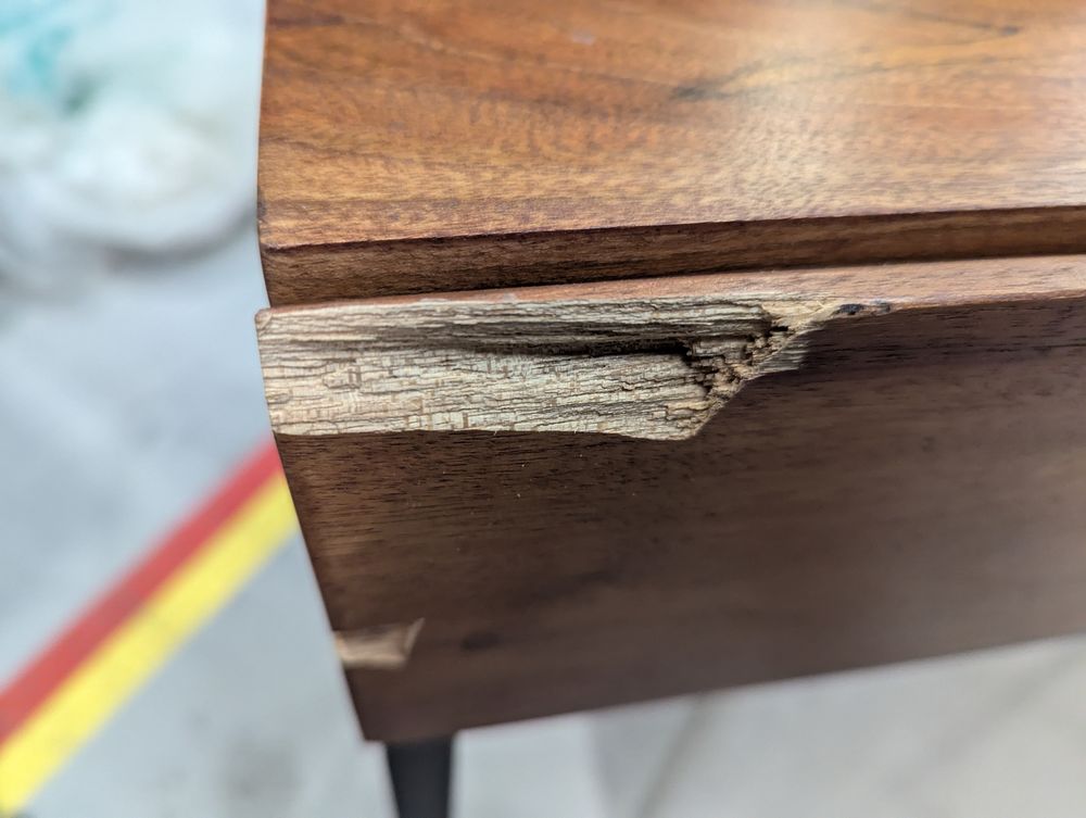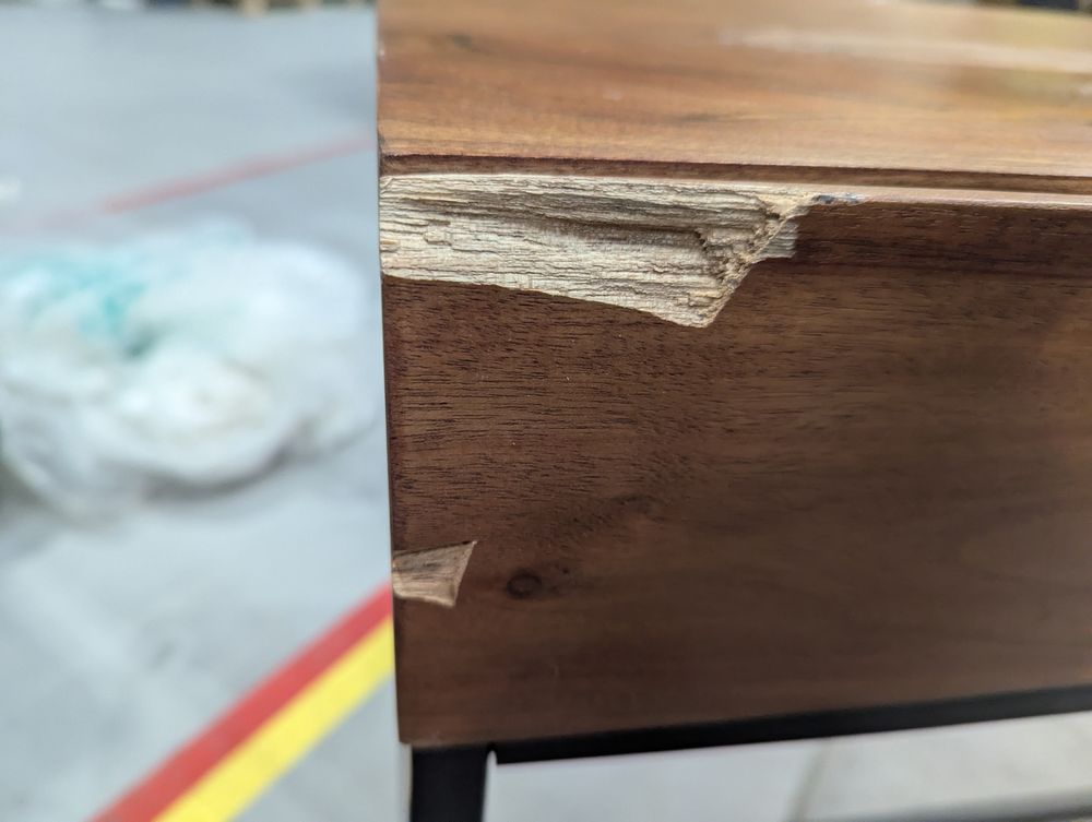 Heavy corner damge, large scuff on center, drawers damaged.