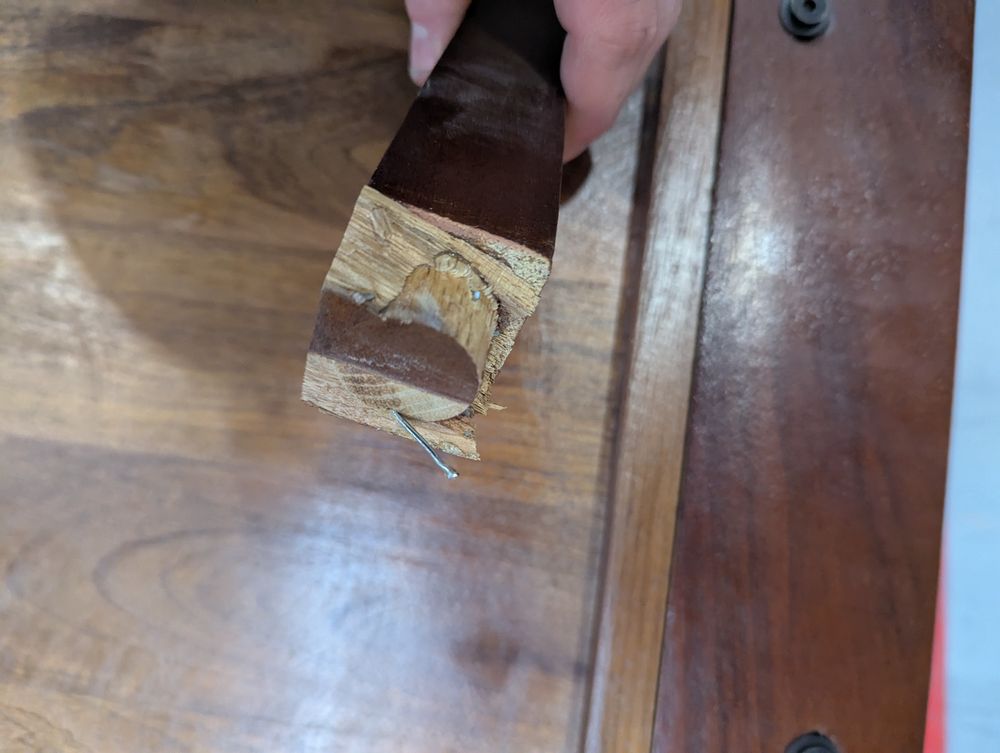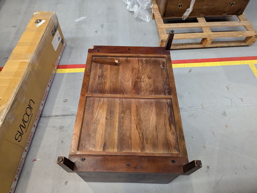 Heavy damage - snapped leg, cracked centre drawer deep scuffs and markings along both parts.