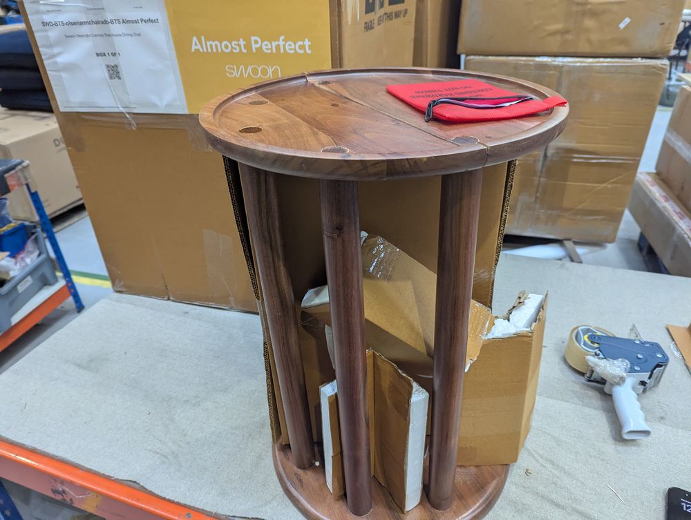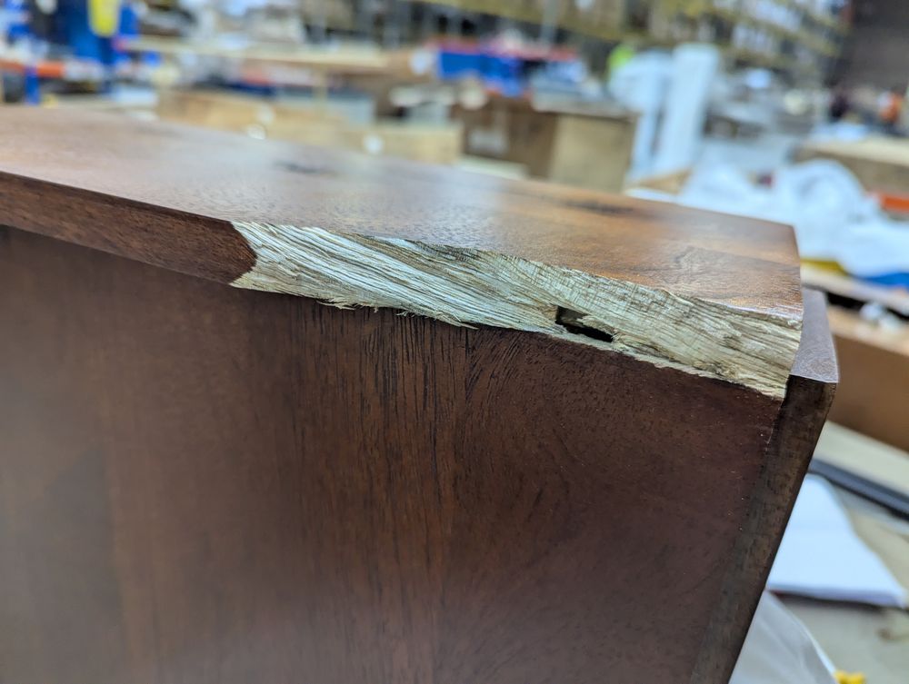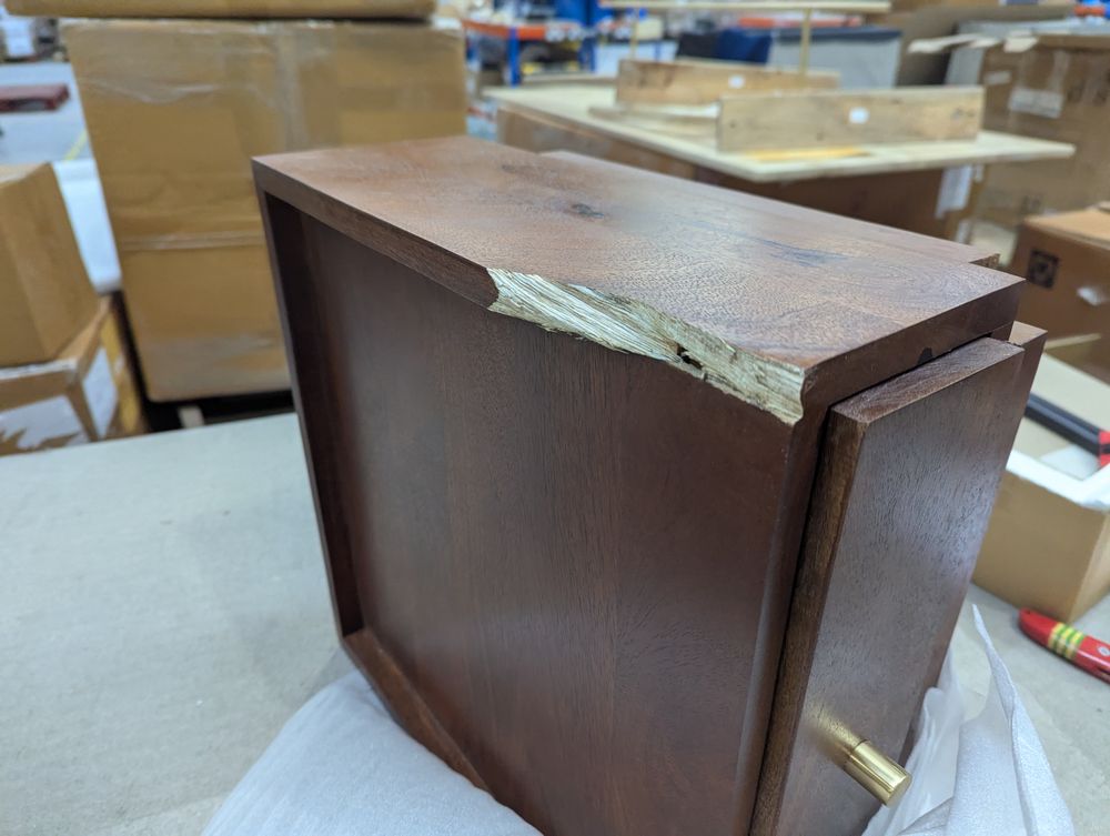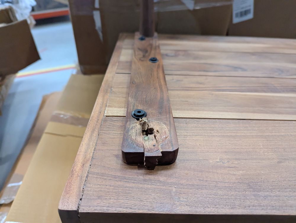Corner damage, leg has completely snapped.